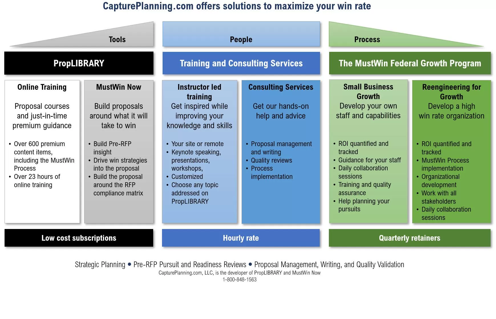 The products and services we offer give you flexible options for supporting the growth of your company and improving your win rate. PropLIBRARY. You're on PropLIBRARY right now. Take a look around. Here's what MustWin Now does at a glance. Training and consulting services. If you need help winning contracts and growing your business, let's talk about what we can do to help. Tell us about the size, scope, complexity, and deadline for what you have in mind so we have enough inf- 0 comments