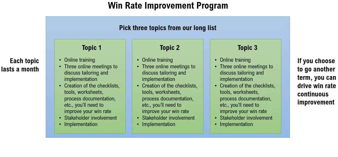 This program is a hybrid. It blends training with process development. It blends online self-study with instructor-led training. It blends course materials with real world tools and performance. It blends learning with implementation. It produces change. It is about implementing the tools, processes, and things you need to improve your win rate. At the end of each term, if you start another, you have a continuous improvement program for about a thousand dollars a month that will constantly- 0 comments