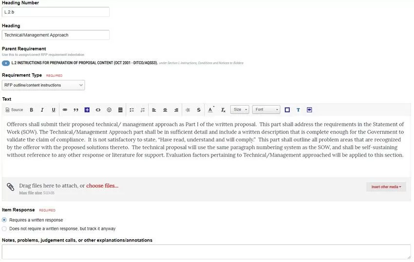 This form above is what you use to enter or edit an RFP requirement in MustWin Now. The key is how simple it is. Just enter the RFP section number and text. The parent requirement is for indentation level, which you may not have to enter at all since when you click the "+" symbol in the column with the RFP requirements, MustWin Now knows who the parent is. Then pick whether it's an instruction, evaluation criteria, performance/delivery requirement, or other requirement from a list. This will hel- 0 comments