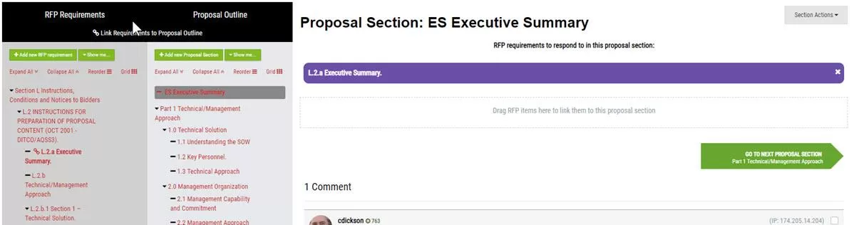 What you see in the image above is a section of the RFP linked to a proposal section. This is part of building an RFP compliance matrix. But what's special about it is that MustWin Now remembers all the linking and when you are in your Proposal Content Plan you can see the full text of the linked RFP items. For more info, see also: MustWin Now: Everything you need to know In the image above, the Executive Summary has been selected from the proposal outline. The linked RFP items (in this- 0 comments