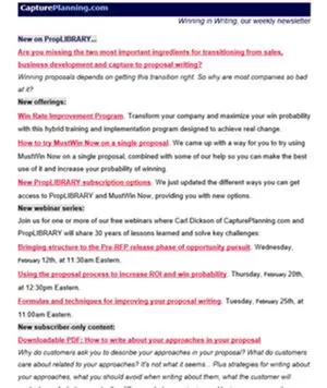 We publish our newsletter weekly. You will receive the next one when it comes out. Please make sure to put it on your email white list or move it to your priority tab so that your email software doesn't hide it from you. Here is the link for downloading your copy of our eBook: Turning Your Proposals Into a Competitive Advantage Here are some other useful links: Beginners should start here Why your good proposal is going to lose What is the simplest, eas- 0 comments