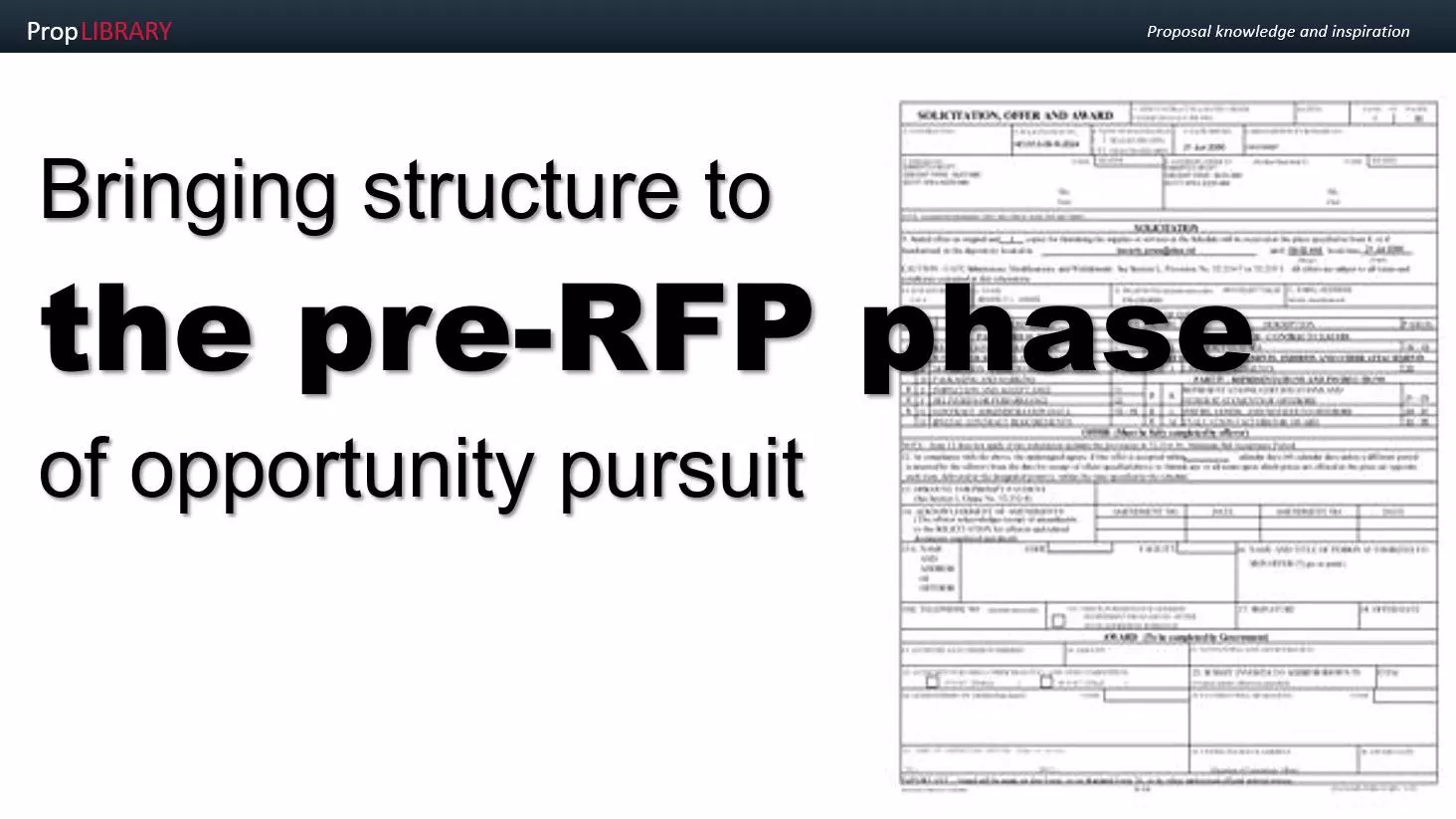 This course divides the pre-RFP pursuit into these modules: Activities that occur during pre-RFP pursuit (this module) Bringing structure to the pre-RFP phase (next module) Preparing to transition from pre-RFP pursuit to the proposal Starting at RFP release (because it happens) This module is primary about setting the stage for customer interaction in anticipation of a proposal. In this module we'll document the activities that occur in a pursuit before the RFP
