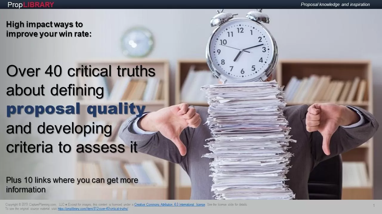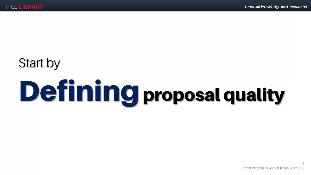 It’s important to be able to define proposal quality if you want to make sure that the proposal you develop reflects it. We define it as a proposal that reflects what it will take to win. We define what it will take to win as part of our process, reaching all the way back before the RFP is released so that the questions we ask and information we gather enable us to say what it will take to win. We use Proposal Content Planning to bring what it will take to win together with the other things- 0 comments