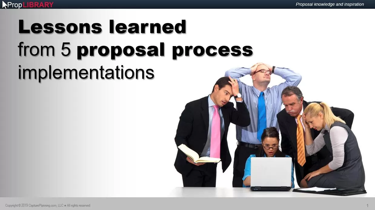 One of the things that I’ve learned by authoring the MustWin Process and having personally been involved with countless process implementations at companies reengineering their proposal processes is that context matters. Much of what goes into winning proposals occurs outside of the process. Consider how decisions get made and what expectations people have outside of the proposal. How is the proposal impacted by the company’s strategic planning and positioning efforts? Who sets quality s- 0 comments
