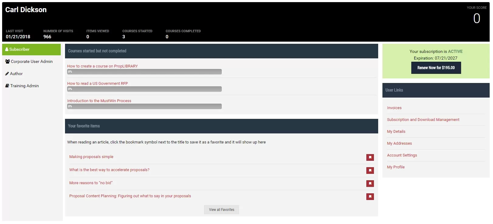 When you sign into PropLIBRARY, you see your Dashboard and it replaces the home page. If you surf away, then simply going to the home page by clicking on our logo will bring you back to the Dashboard. Here's what's there and some of the ways to use it. See your statistics and your Score! At the top, just under your name are some statistics about your utilization. It shows the number of times you've visited, how many items you've viewed, and course activity. It also shows your Score!- 0 comments