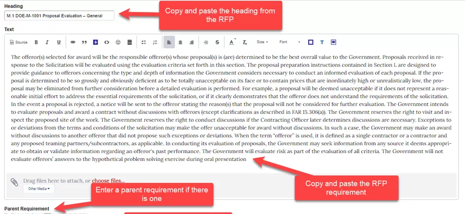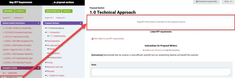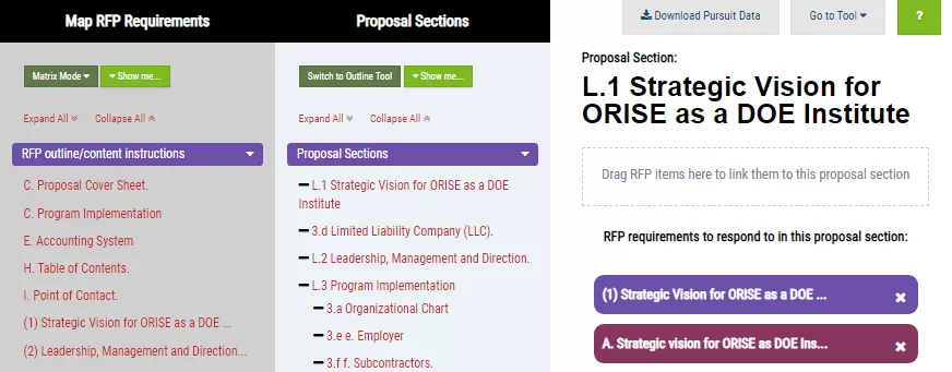 Before something can go into your proposal, you have to decide where in your outline it should go. MustWin Now provides several ways to connect RFP requirement to the proposal outline. You can even drag and drop RFP requirements onto the landing zone for each proposal section. Once the association is made, MustWin Now remembers all the RFP requirements that are relevant to each section. If you want, you can use this to generate a very traditional looking compliance matrix and download it- 0 comments
