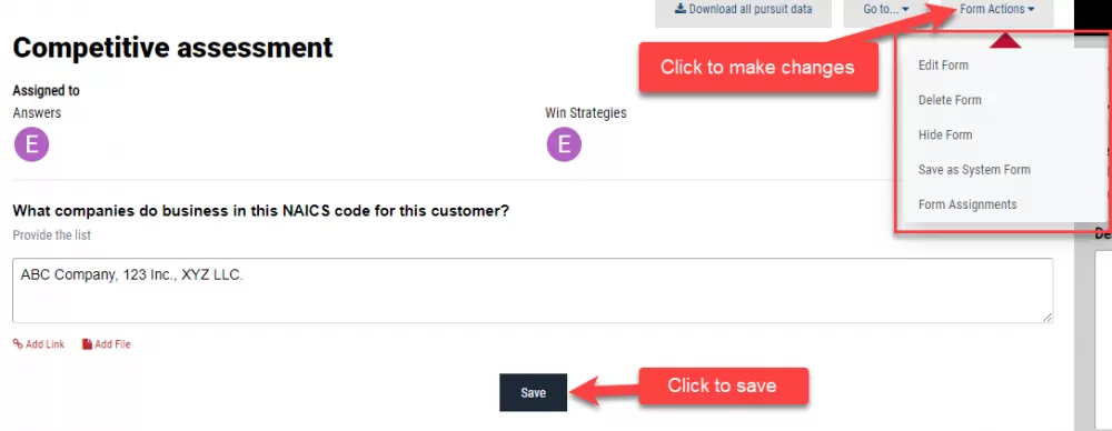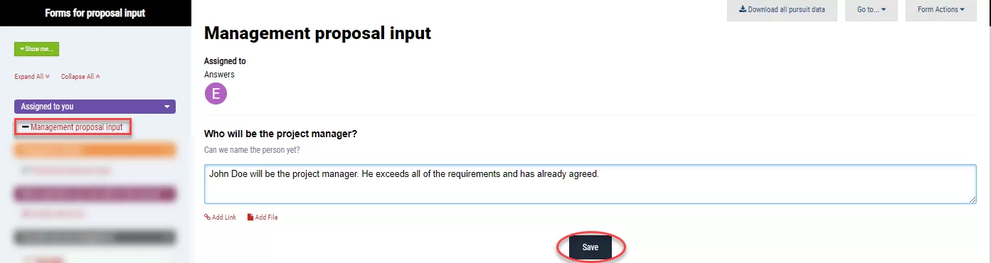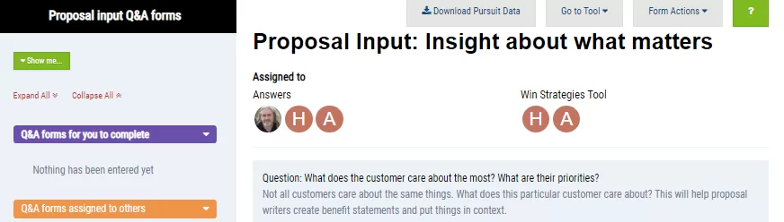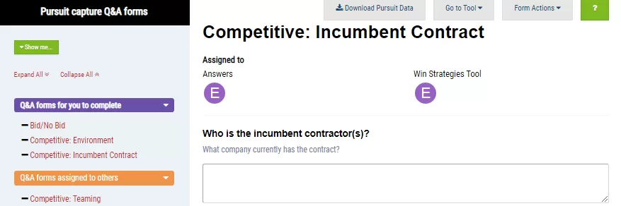 The Proposal Input Forms tool is similar in function to the Pre-Proposal Capture Q&A tool. The key difference is that the Pre-Proposal Capture Q&A tool is intended for gathering information and guiding the pursuit long before the RFP is released. Proposal Input Forms are intended to gather and assess what you know immediately at RFP release so that it can impact document construction. The functionality of the tool is similar, but the type and purpose of the information is different.- 0 comments