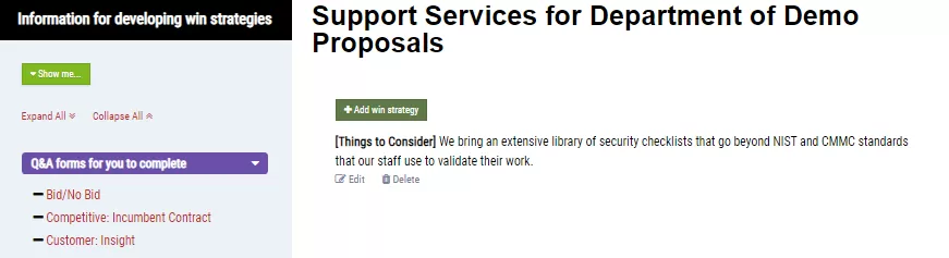 The win strategy development tool is intended to be used after you have used the Pre-Proposal Capture Q&A Forms and Proposal Input Forms before you start building your compliance matrix. It will let you do things out of sequence, including jumping straight into win strategy development without doing any preparation or working on your win strategies after you've started content planning. In the world of proposals we don't always get to do things the ideal way and we don't want our tools to br- 0 comments