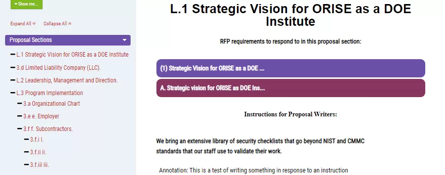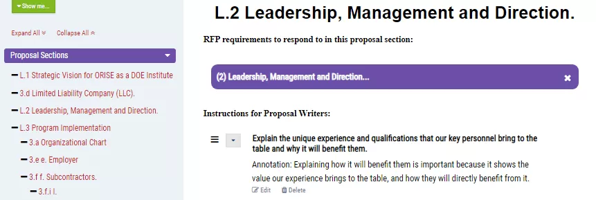 Intro... Use the left sidebar to select which proposal section to view. You can change which proposal sections appear in the sidebar by clicking the green "Show me..." button and selecting either all proposal sections in sequence, only proposal sections with notes, or only unlinked proposal sections. When you select a proposal section, you will see any instructions for proposal writers as well as the RFP requirements so you know what you should be writing about.