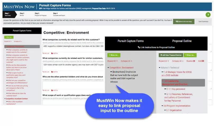 Accelerating the proposal process by making it real-time and interactive Companies are using MustWin Now to drive strategy into their proposals before they even get written. If your RFPs: Have instructions, evaluation criteria, and a statement of work Require a compliance matrix to figure out which RFP requirements should be addressed in which proposal sections Require mapping your win strategies to the document in order to get the highest score Click here to fi- 0 comments